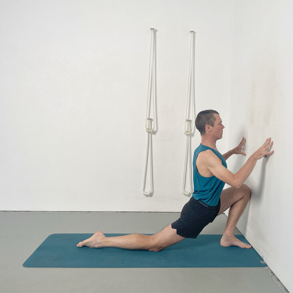 - Maintain back knee straight / heel pressing onto the block. Use a light downward drag of the fingertips against thewall to lift the chest and front pelvis, and keep the outer back hip turning forwards.